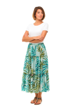 Una maxifalda escalonada con un vibrante estampado de hojas tropicales en tonos verdes, verde azulado y toques morados, sobre un fondo de color aguamarina claro o menta. Tiene una cintura elástica para mayor comodidad y unos volantes fluidos que añaden volumen y movimiento, perfectos para llevar en un centro turístico o para salir en verano.